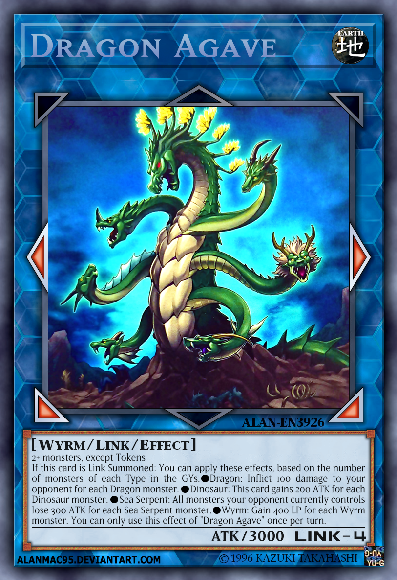If this card is Link Summoned: You can apply these effects in sequence, dependinng on the Types of monsters in the GYs (skip over any that do not apply). You can only use this effect of “Agave Dragon” once per turn.