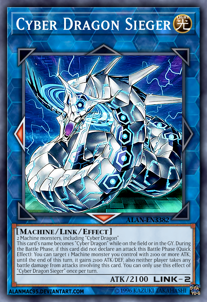This card's name becomes "Cyber Dragon" while on the field or in the GY. During the Battle Phase, if this card did not declare an attack this Battle Phase (Quick Effect): You can target 1 Machine monster you control with 2100 or more ATK; until the end of this turn, it gains 2100 ATK/DEF, also neither player takes any battle damage from attacks involving this card. You can only use this effect of "Cyber Dragon Sieger" once per turn.