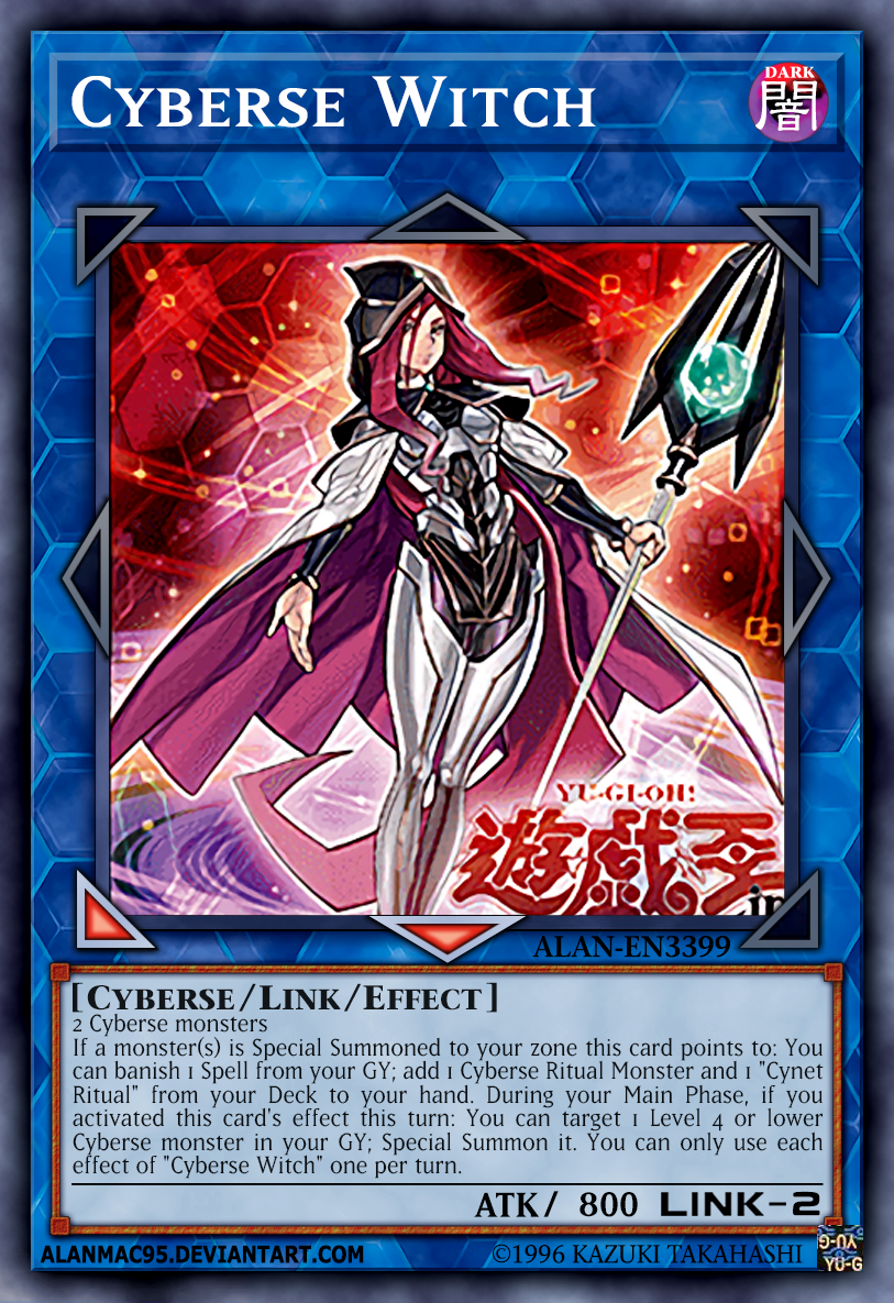 If a monster(s) is Special Summoned to your zone this card points to: You can banish 1 Spell from your GY; add 1 Cyberse Ritual Monster and 1 "Cynet Ritual" from your Deck to your hand. During your Main Phase, if you activated this card's effect this turn: You can target 1 Level 4 or lower Cyberse monster in your GY; Special Summon it. You can only use each effect of "Cyberse Witch" one per turn.