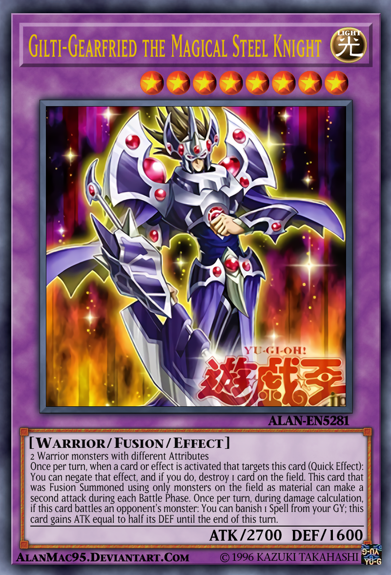 Once per turn, when a card or effect is activated that targets this card (Quick Effect): You can negate that effect, and if you do, destroy 1 card on the field. This card that was Fusion Summoned using only monsters on the field as material can make a second attack during each Battle Phase. Once per turn, during damage calculation, if this card battles an opponent's monster: You can banish 1 Spell from your GY; this card gains ATK equal to half its DEF until the end of this turn.