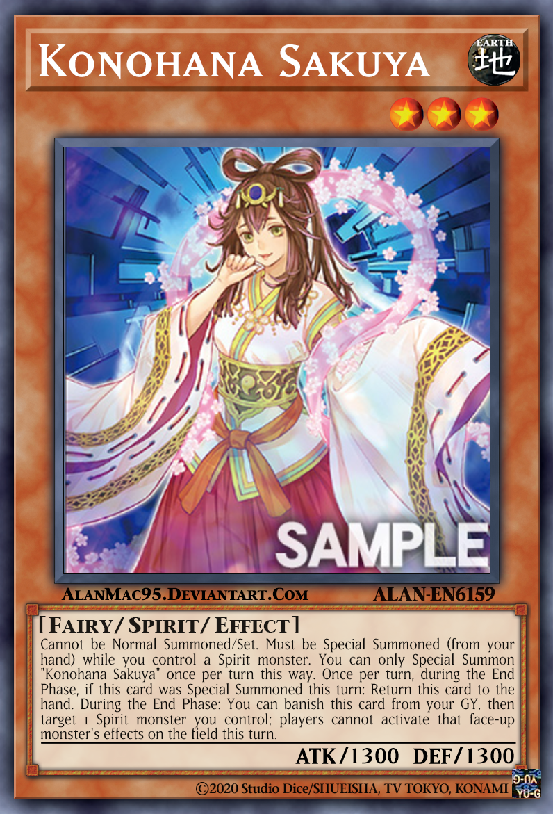 Cannot be Normal Summoned/Set. Must be Special Summoned (from your hand) while you control a Spirit monster. You can only Special Summon "Konohana Sakuya" once per turn this way. Once per turn, during the End Phase, if this card was Special Summoned this turn: Return this card to the hand. During the End Phase: You can banish this card from your GY, then target 1 Spirit monster you control; players cannot activate that face-up monster's effects on the field this turn.