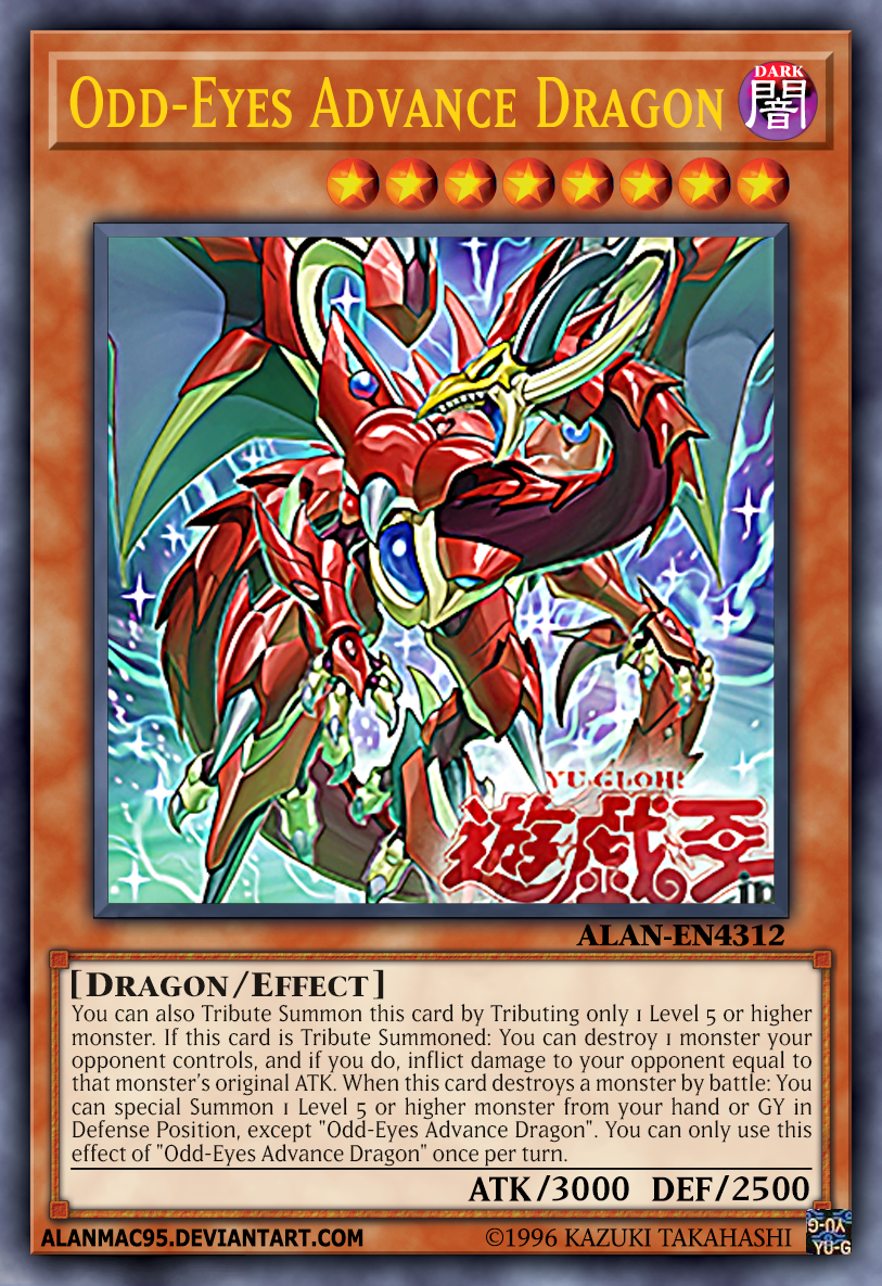 You can also Tribute Summon this card by Tributing only 1 Level 5 or higher monster. If this card is Tribute Summoned: You can destroy 1 monster your opponent controls, and if you do, inflict damage to your opponent equal to that monster’s original ATK. When this card destroys a monster by battle: You can special Summon 1 Level 5 or higher monster from your hand or GY in Defense Position, except "Odd-Eyes Advance Dragon". You can only use this effect of "Odd-Eyes Advance Dragon" once per turn.